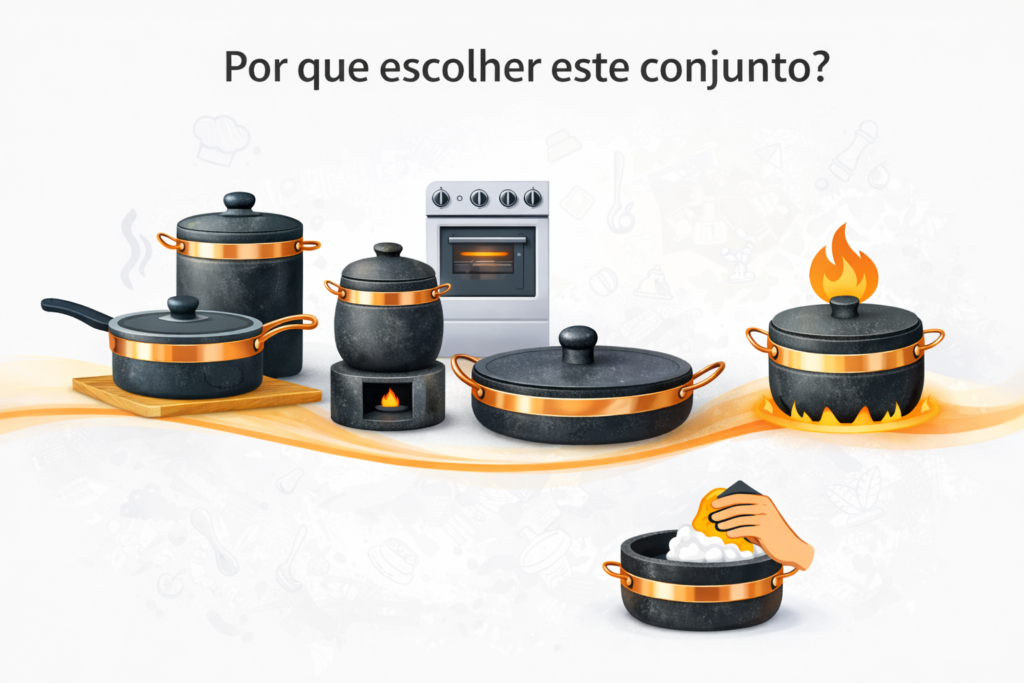 Um conjunto completo para transformar sua rotina na cozinha, com peças versáteis, resistentes e artesanais — tudo pronto para usar em fogão, forno ou fogareiro.